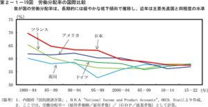 日本の労働分配率は、かつては70%前後と比較的高い水準にあった。しかし1990年代以降は下降傾向が続き、近年は60%前後に落ち着いている。特にバブル崩壊以降、企業は「守りの経営」を強め、利益を賃金よりも内部留保に回す傾向が強まった。